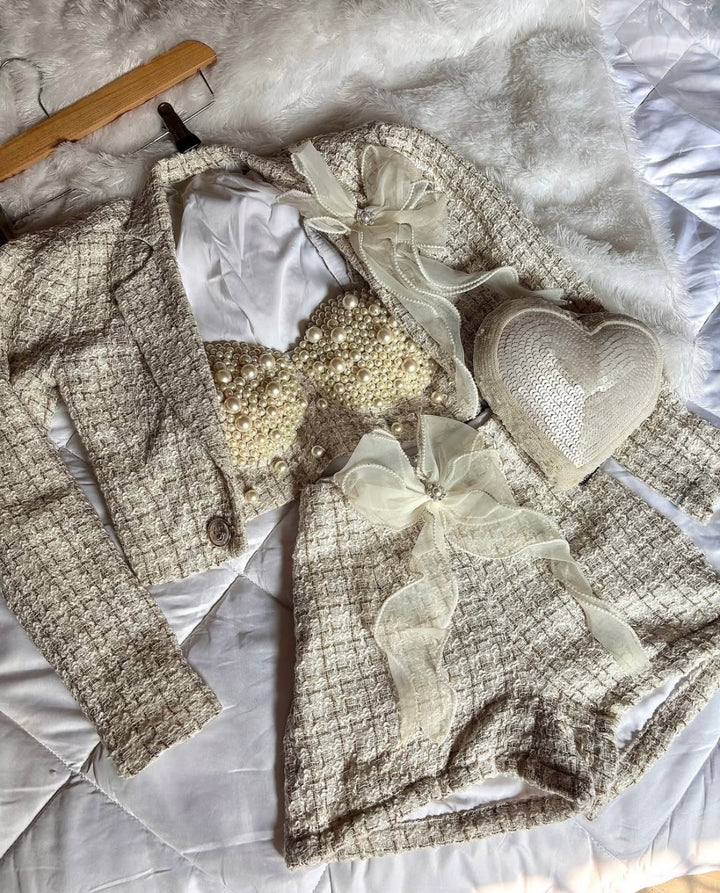 CO-ORD SET- Old money international design of blazer, Pearls bustier, High-waist shorts